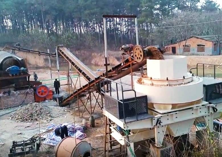 石料由振动给料机均匀的送到颚式破碎机进行粗破,粗破后的物料送进细颚式破碎机进行再次破碎,破碎后的物料由胶带输送机送进振动筛进行筛分,满足江南(中国)进料颗度的石子进江南(中国)进行制砂,不满足要求的返回细颚式破碎机重新破碎,从江南(中国)出来的料物,返回到振动筛重新进行筛分,筛分出的满足要求的砂子,进入洗砂机清洗,清洗后由成品输送带输送即为成品,不满足要求的砂石混合物料,送入江南(中国)进行再次破碎,本生产线最终形成2断闭路循环,根据用户的需要还可以进行多种配置。